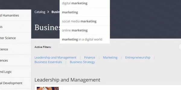 ثم ستظهر لك قائمة بأقسام الموقع على اليسار، وبالضغط على أحد الأقسام ستظهر لك جميع الكورسات الخاصة بهذا المجال.