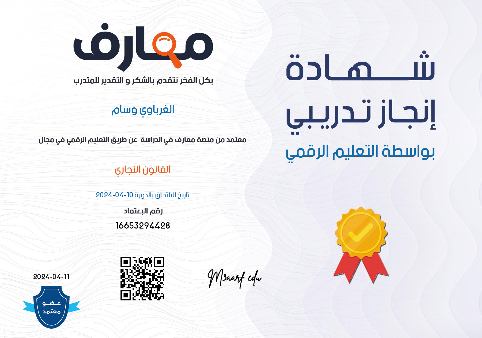 شهادة المتدرب الغرباوي وسام